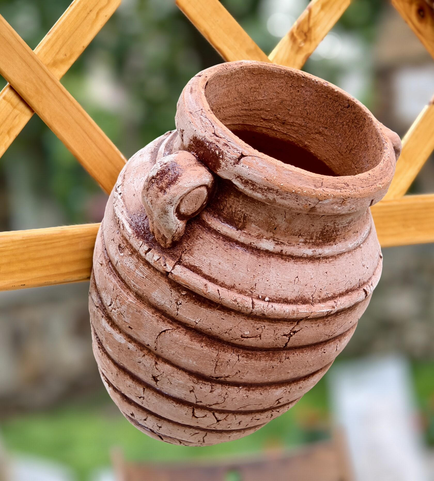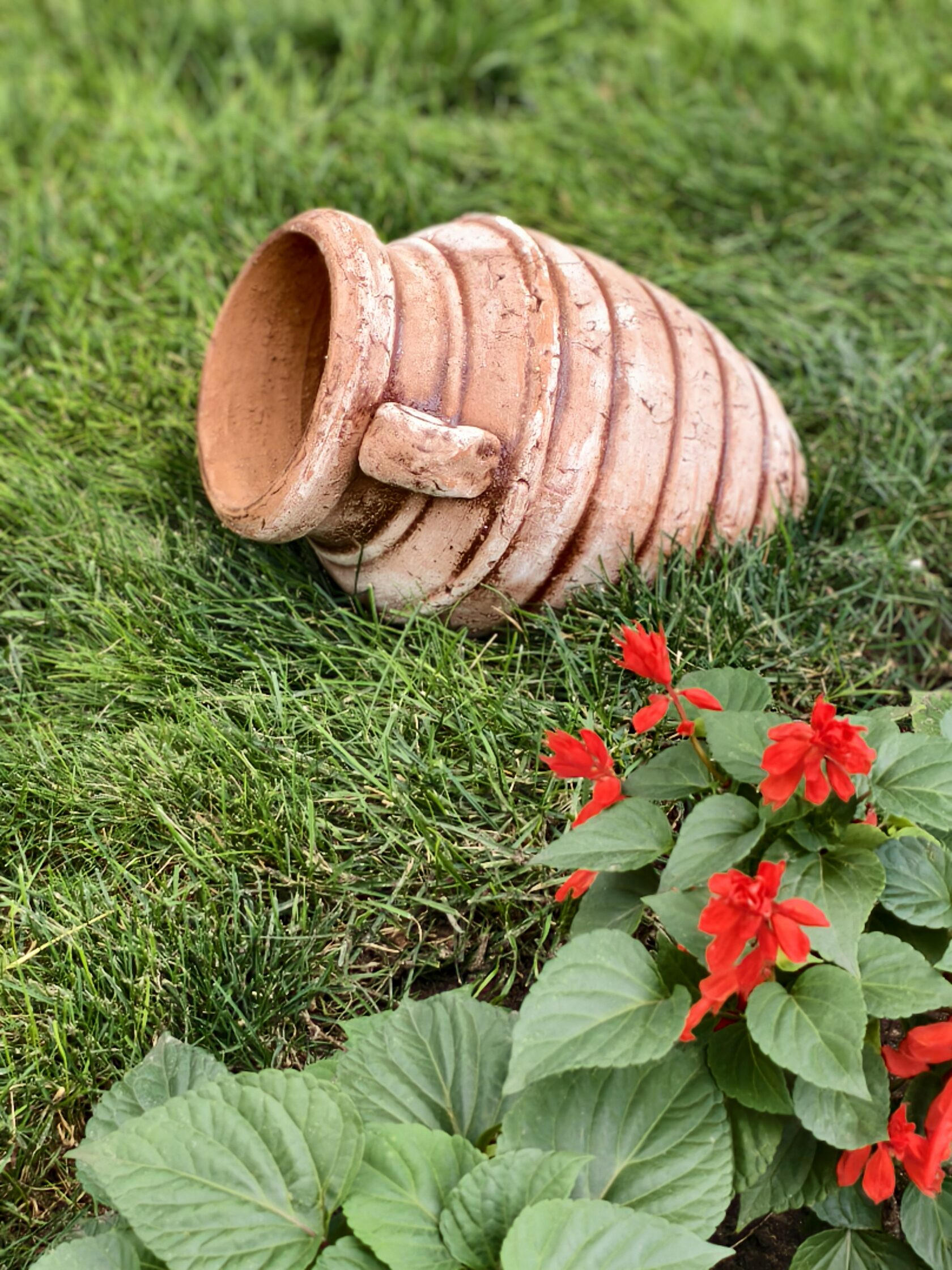 Керамическая амфора «Улей» с красным принтом — это необычное и стильное решение для украшения сада и интерьера.